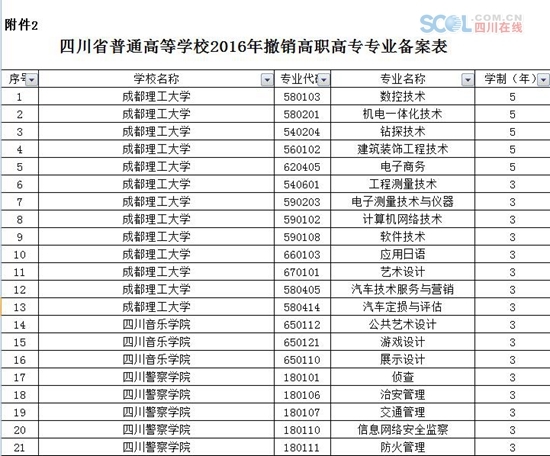 按照教育部要求,四川省教育厅组织开展了新设专业申报和拟招生专业平台报送工作,共有68所高校申报了283个拟新设高职高专专业,经专家评议、形式审查、网上信息公示和教育部审核(教育部仅对国控专业进行审核),同意68所高校的257个新增高职高专专业予以备案招生;同时,对成都理工大学等26所普通高等院校撤销的137个高职高专专业予以备案,已撤销和未同意备案的专业,2016年不得列入招生计划。